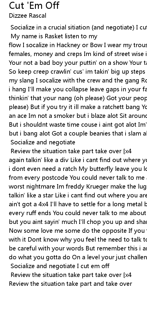 [Chorus] Socialize in a crucial sitiation (and negotiate) I cut em off [x2] Review the situation take part take over [x4] My name is Rasket listen to my flow I socalize in Hackney or Bow I wear my trousers ridiculiously low I love females, money and creps Im kind of street wise i think that you should know Your not a bad boy your puttin' on a show Your talkin'bout creepin' up on Rusko So keep creep crawlin' cus' im takin' big up steps My name is Rasket listen to my slang I socalize with the crew and the gang Roll utes on the street is where i hang I'll make you collapse leave gaps in your face Your in your neighborhood thinkin' that your nang (oh please) Got your people thinkin' that i'm dang (oh please) But if you try it ill make a ratchett bang You could never outplay me im an ace Im not a smoker but i blaze alot Sit around puffin' waste my days alot But i shouldnt waste time couse i aint got alot Im' just lazy Im not a ratchett but i bang alot Got a couple beanies that i slam alot I make em' happy with my fingers and my hand alot (finger) Im just crazy [Chorus] Socialize and negotiate I cut em off [x2] Review the situation take part take over [x4] There you go again talkin' like a div Like i cant find out where you live Take off your latch i dont even need a ratch My butterfly leave you lookin like a sieve Met bad boys from every postcode You could never talk to me about road Stop dreamin' im your worst nightmare Im freddy Krueger make the luger explode There you go again talkin' like a star Like i cant find out where you are Kick off your door i ain't got a 4x4 I'll have to settle for a long metal bar I've met bad boys from every ruff ends You could never talk to me about skenz (click click) Talk tuff but you aint sayin' much I'll chop you up and share you out between your friends Now some love me some do the opposite If you feel to move to me please get on with it Dont know why you feel the need to talk to birds But talk is dangerous be careful with your words But remember this i am you So if you think your real do what you gotta do On a level your just challengin' yourself If your feelin' brave go ahead and burn yourself [Chorus] Socialize and negotiate I cut em off [x2] Review the situation take part take over [x4] I cut em off, i cut em off Review the situation take part and take over |