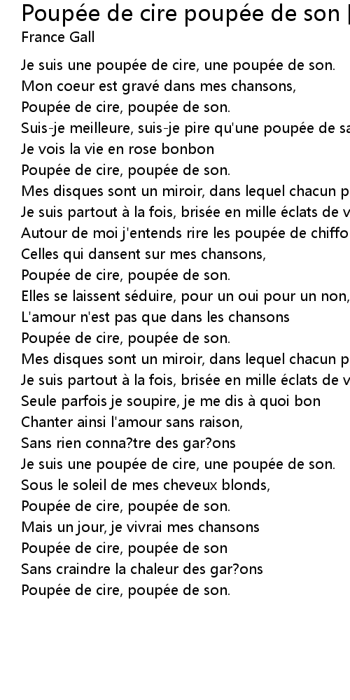 | [00:07] | Je suis une poupé e de cire, une poupé e de son. |