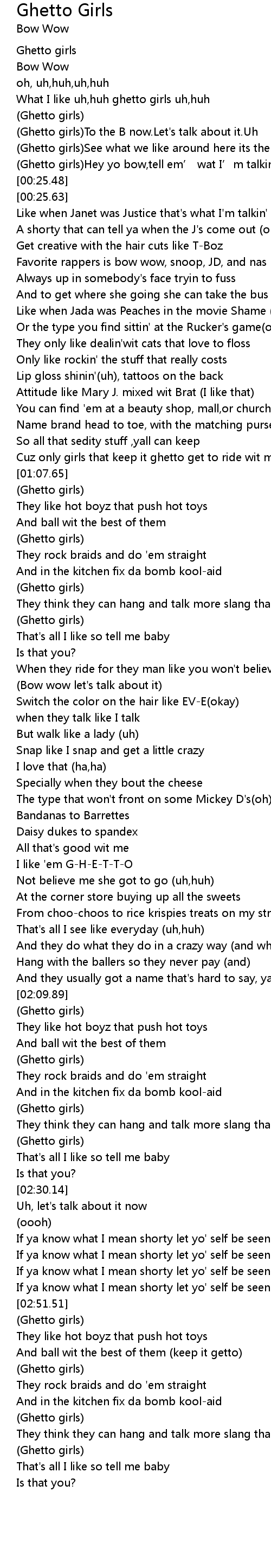| [00:02.98] | What I like uh, huh ghetto girls uh, huh |