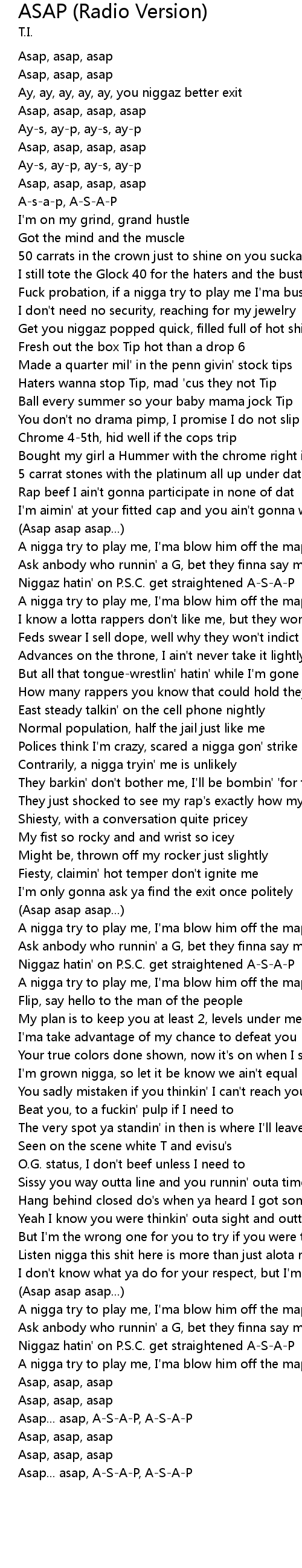 | [04:09.293] | A nigga try to play me, I'ma blow him off the map A-S-A-P |
