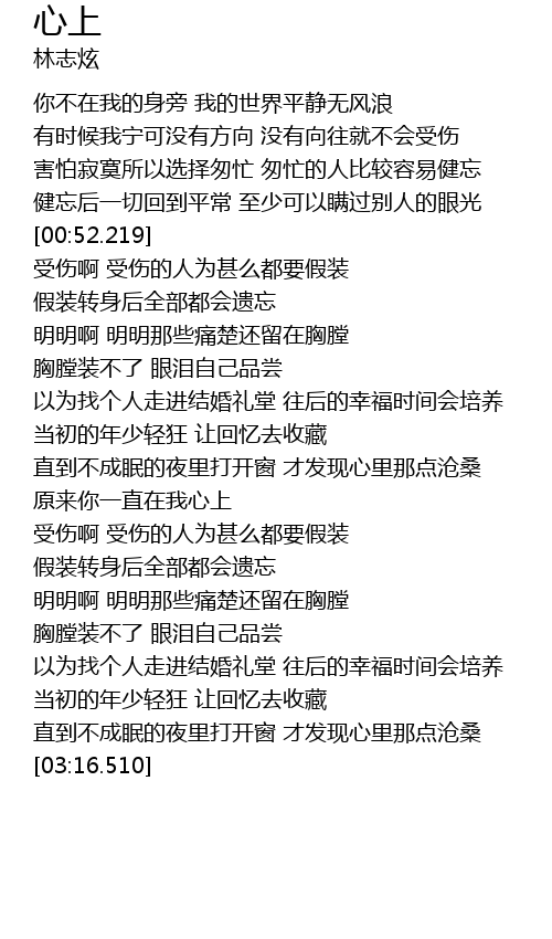 | [02:15.0] | 受伤啊 受伤的人为甚么都要假装 |