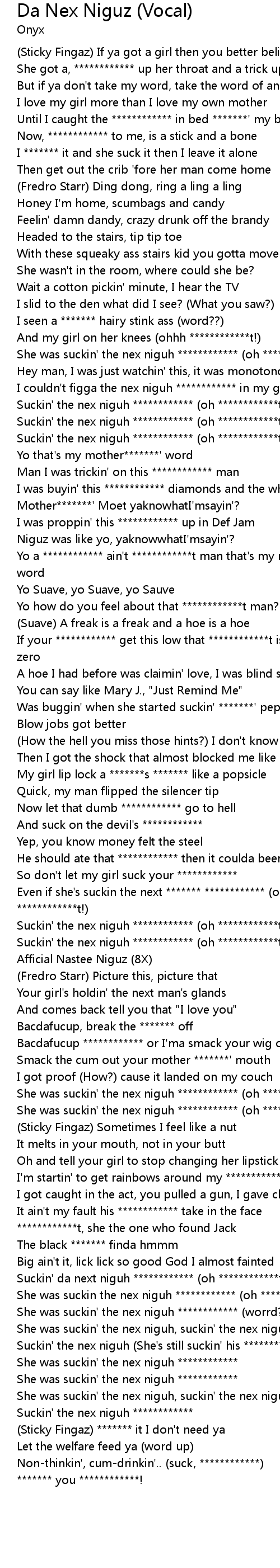 | [03:28.113] | She was suckin' the nex niguh ************ (worrd?) |