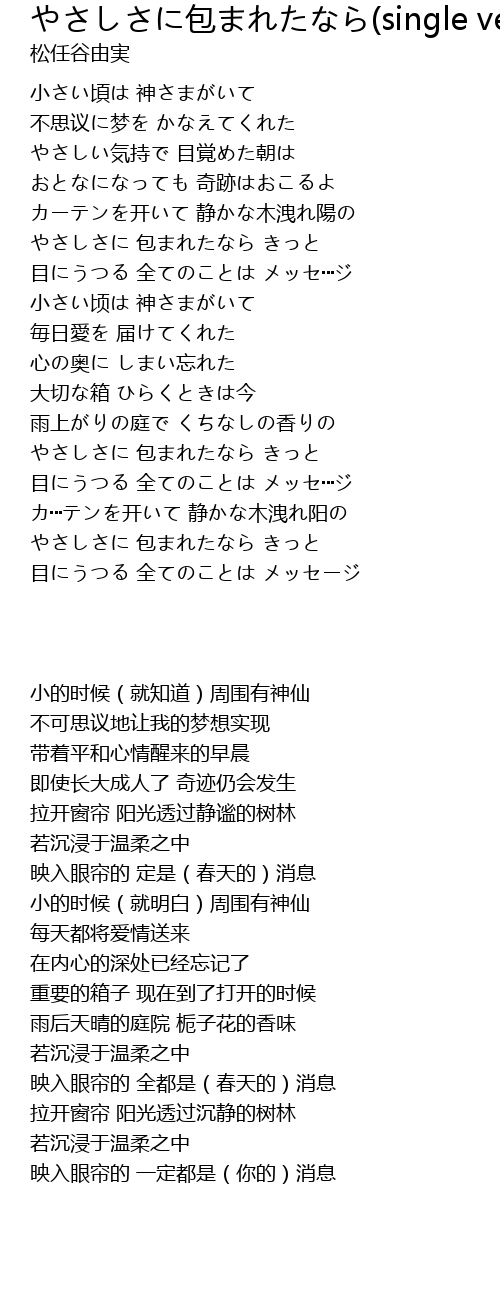 | [02:32.31] | やさしさに 包まれたなら きっと |