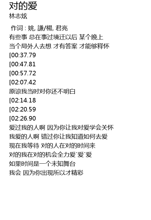 | [03:43.66][02:26.90][01:22.70] | 对的我在对的机会全力爱 爱 爱 |