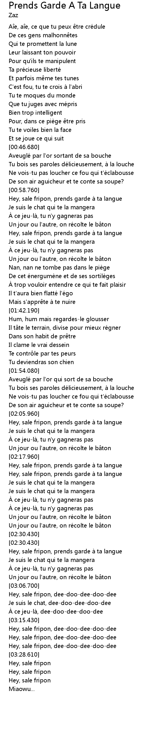 | [01:14.440] | Je suis le chat qui te la mangera |