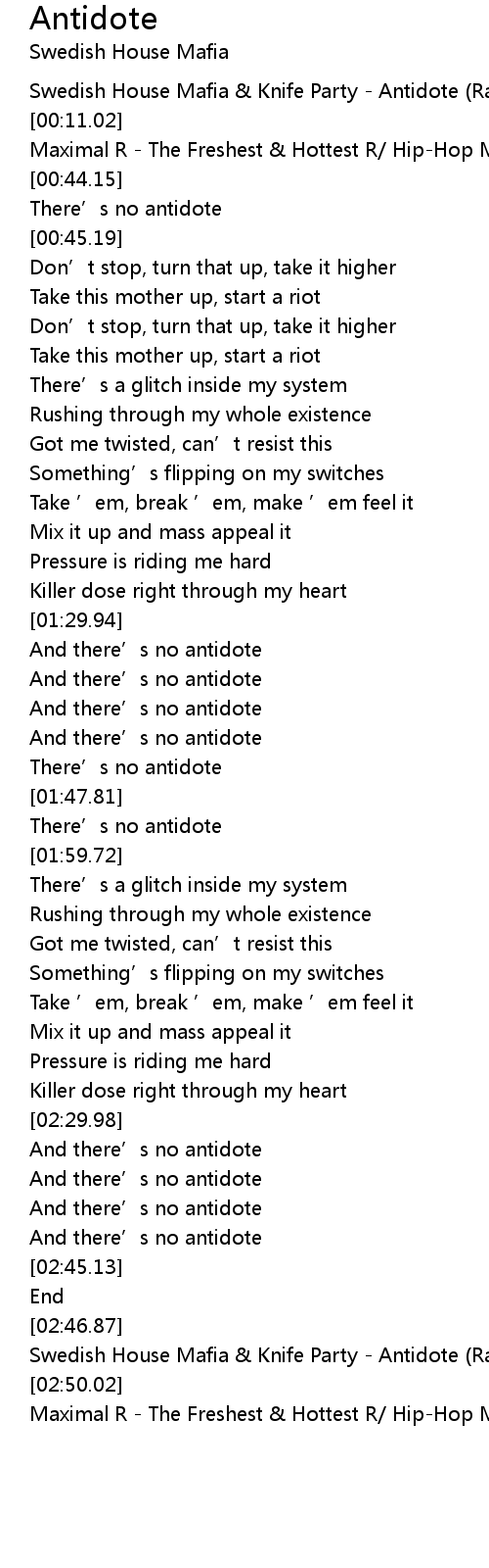 | [00:00.02] | Swedish House Mafia & Knife Party - Antidote (Radio Edit) |