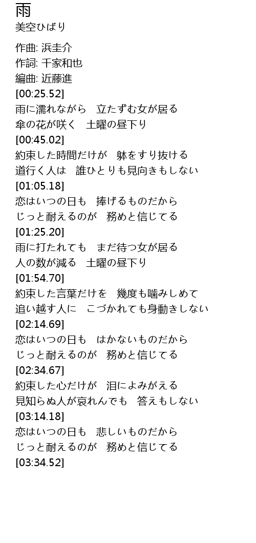 | [00:25.58] | 雨に濡れながら 立たずむ女が居る |