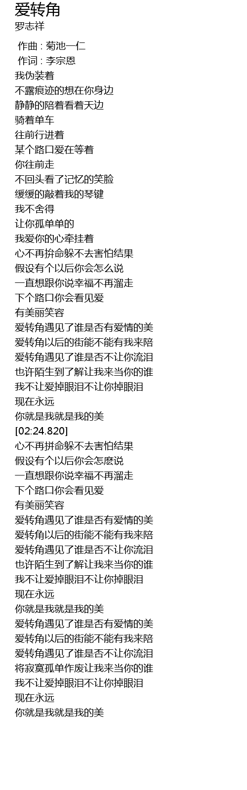 | [03:20.079] | 爱转角遇见了谁是否不让你流泪 |