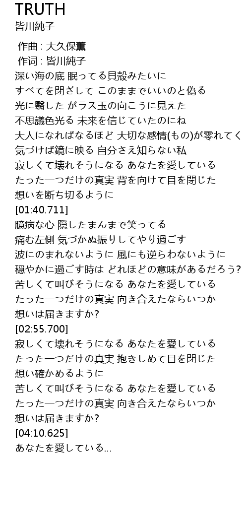 | [03:26.480] | たった一つだけの真実 抱きしめて目を閉じた |