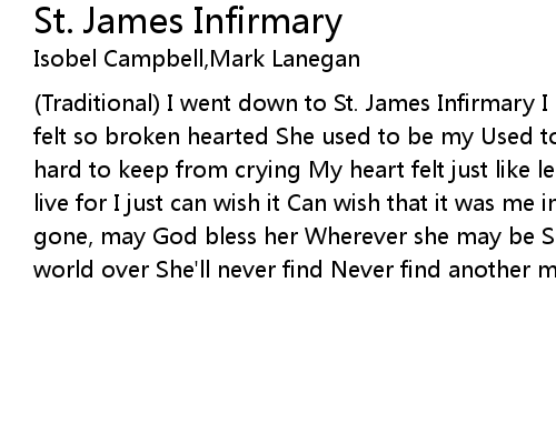 | (Traditional) I went down to St. James Infirmary I heard my baby groan And I felt so broken hearted She used to be my Used to be my very own And I tried so hard to keep from crying My heart felt just like lead She was all that I had to live for I just can wish it Can wish that it was me instead Now she's gone She's gone, may God bless her Wherever she may be She has searched the whole wide world over She'll never find Never find another man like me |