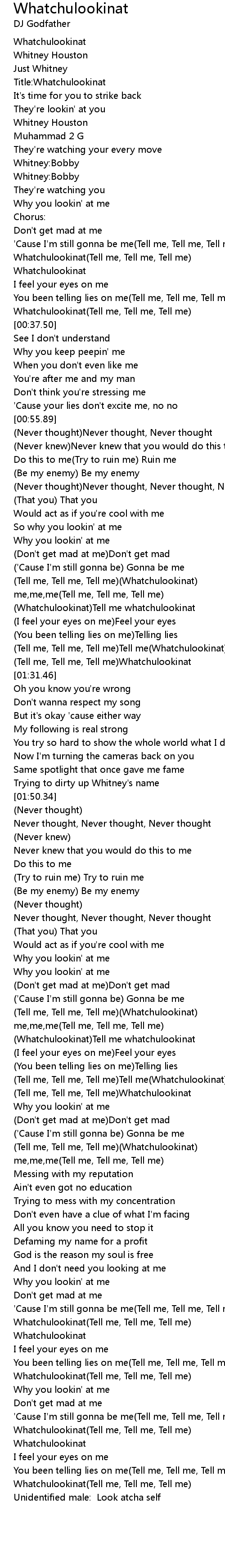 [02:18.36] (Whatchulookinat)Tell me whatchulookinat
