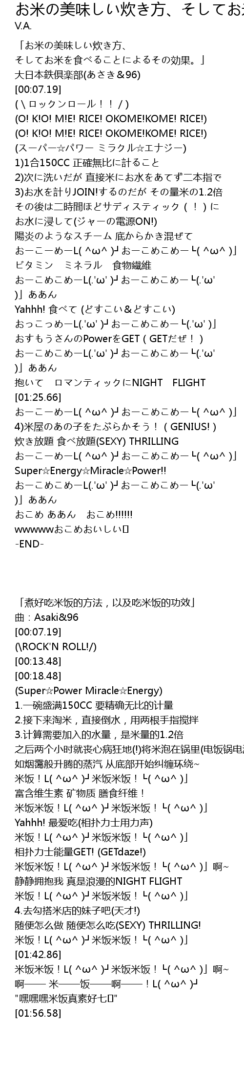 | [00:18.48] | (O! K!O! M!E! RICE! OKOME!KOME! RICE!) |