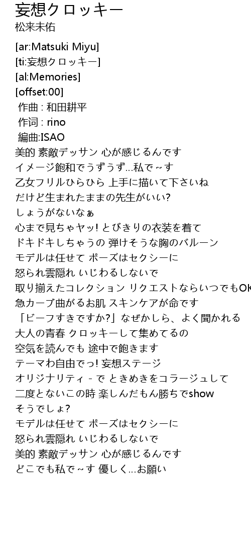 | [02:13.50] | オリジナリティ-で ときめきをコラージュして |