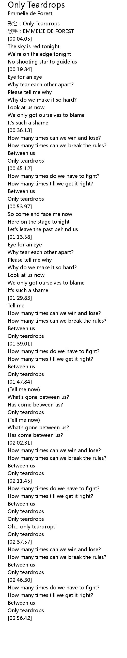 | [00:01.47] | 歌名:Only Teardrops |