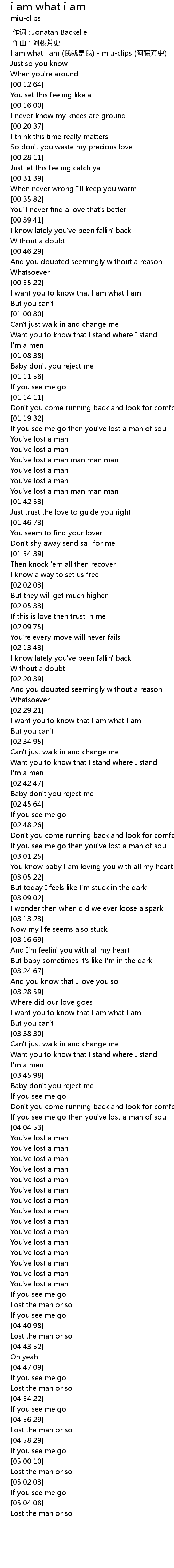 | [00:00.00] | I am what i am (我就是我) - miu-clips (阿藤芳史) |