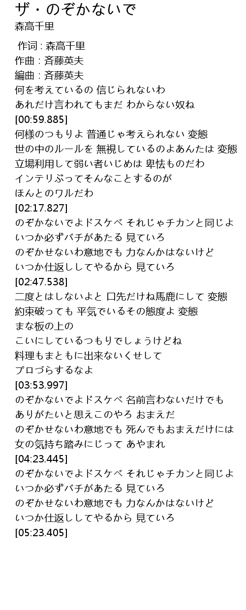 | [03:25.135] | 約束破っても 平気でいるその態度よ 変態 |