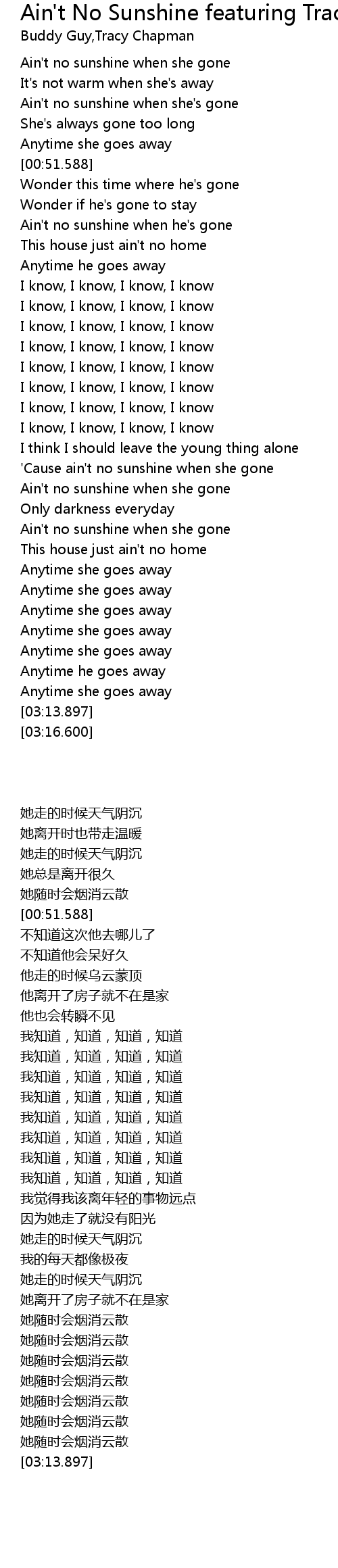 [02:15.094] Ain't no sunshine when she gone