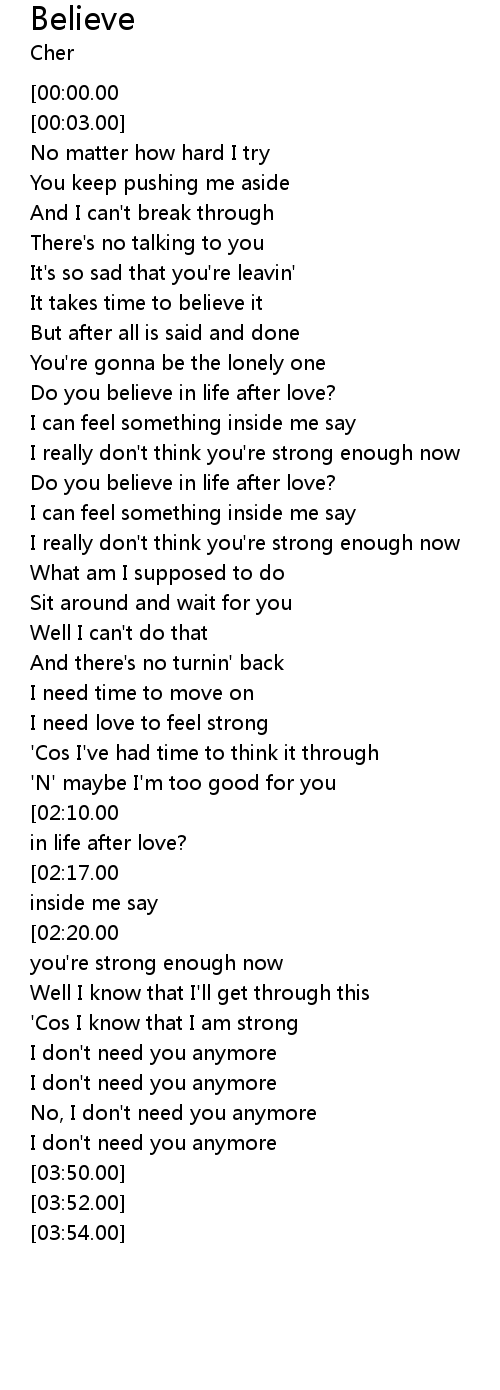 [01:54.00][02:10.00][02:54.00][03:07.00][03:23.00][03:37.00] Oh, do you believe in life after love?