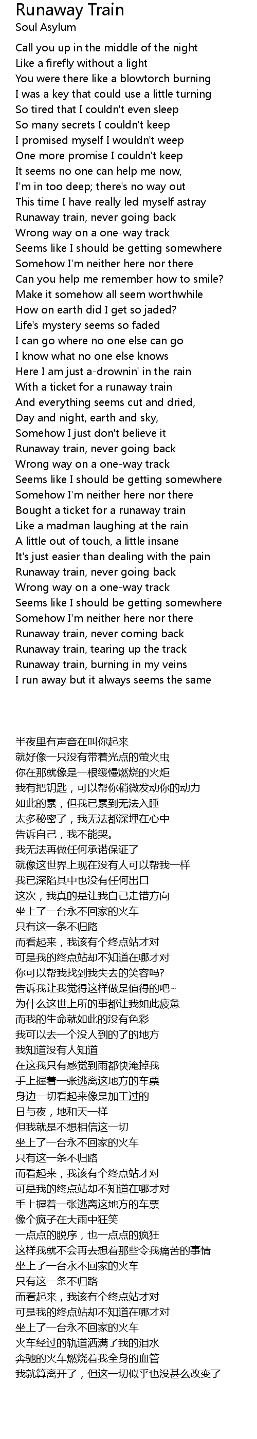 Runaway Train Lyrics