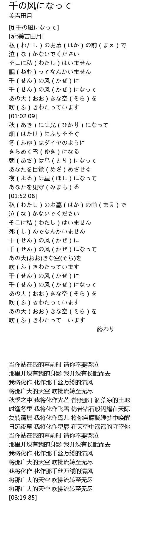 | [02:24.19] | 千(せん)の风(かぜ)に 千(せん)の风(かぜ)になって |