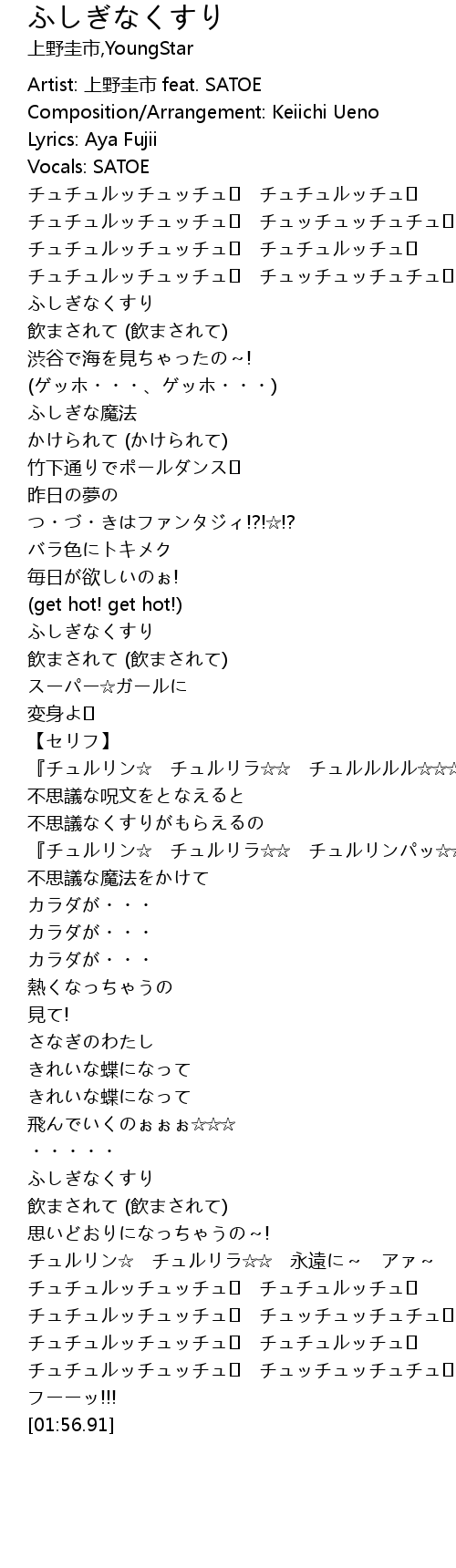 | [00:08.72] | チュチュルッチュッチュ♪ チュチュルッチュ♪ |