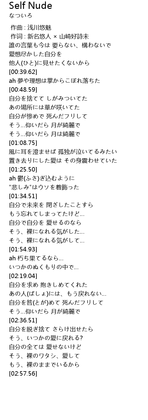 | [02:49.70] | そう、裸のワタシ、愛して |