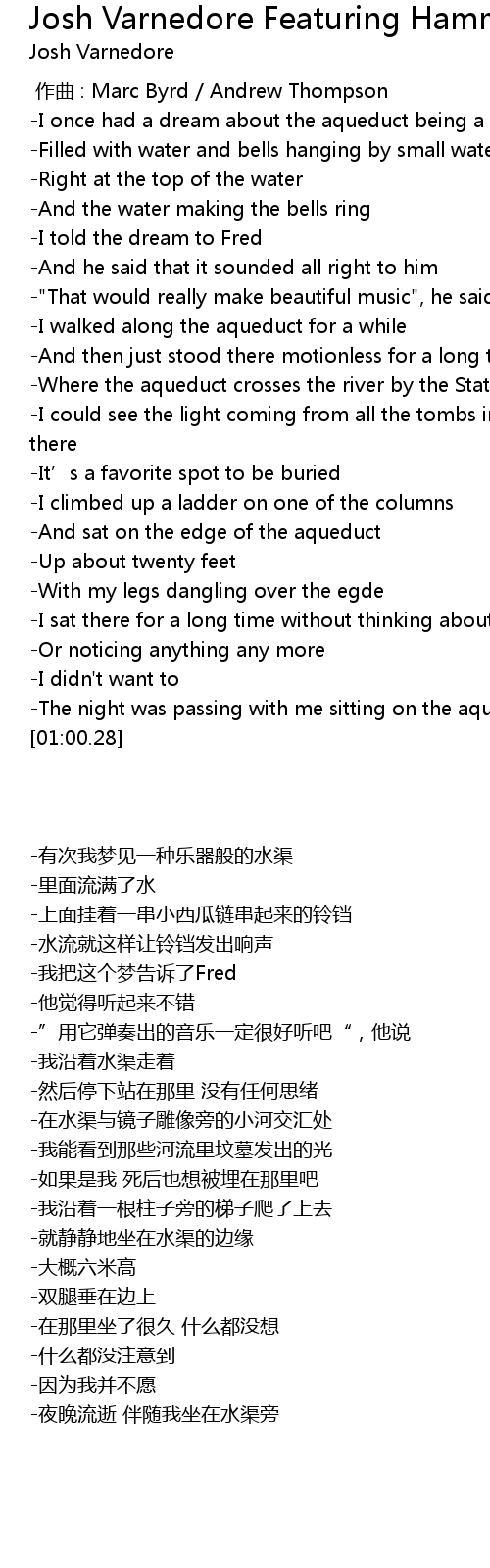 | [00:02.75] | I once had a dream about the aqueduct being a musical instrument |