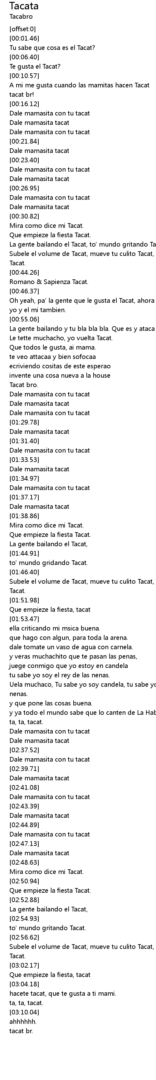 [01:47.40] Subele el volume de Tacat, mueve tu culito Tacat, tambien el bechito. Tacat.