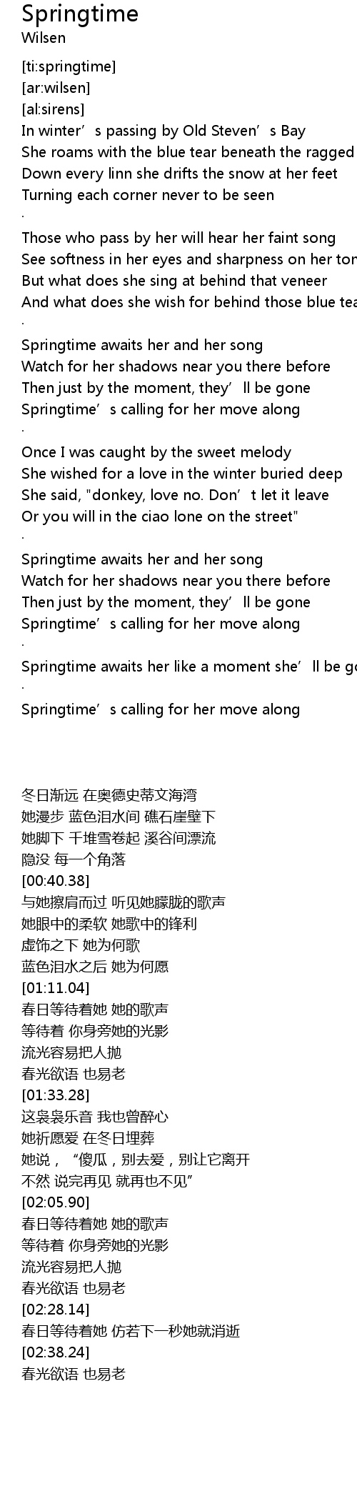 | [02:34.06] | Springtime awaits her like a moment she’ll be gone |