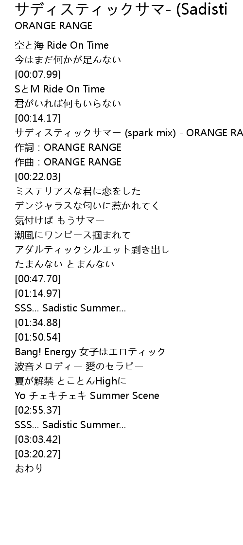 | [00:14.74] | サディスティックサマー (spark mix) - ORANGE RANGE |