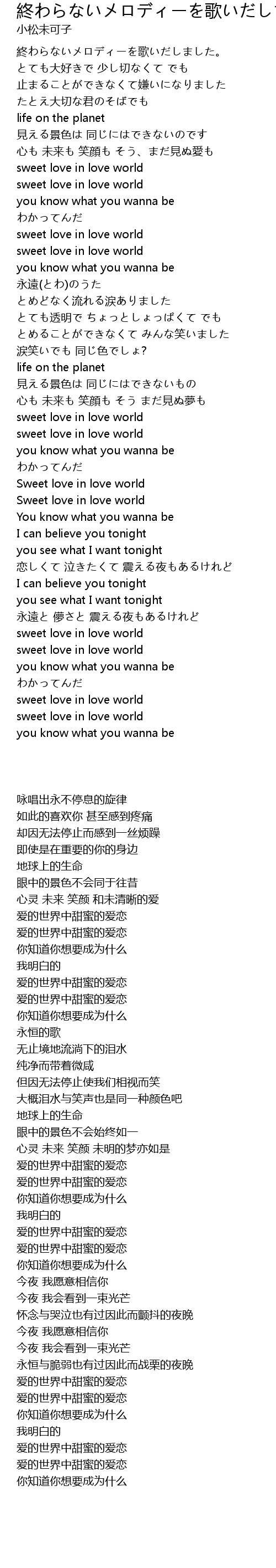 | [00:17.340] | 終わらないメロディーを歌いだしました。 |