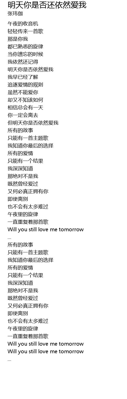 | [00:55.500] | míng tiān nǐ shì fǒu yī rán ài wǒ |