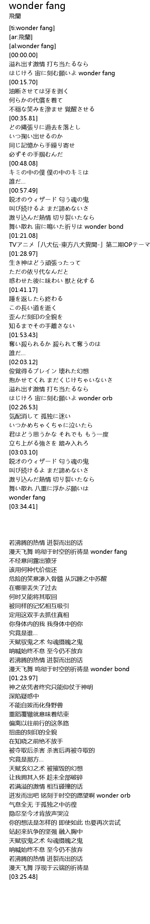 | [00:09.08] | はじけろ 宙に刻む願いよ wonder fang |