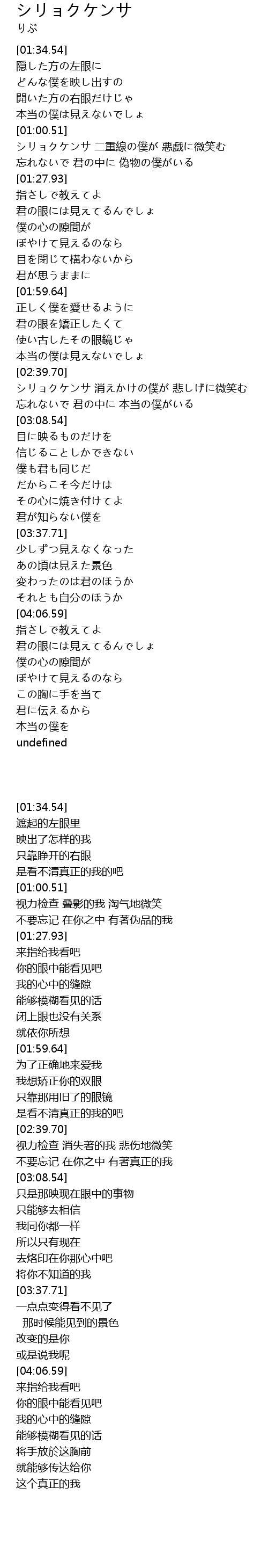 | [02:40.69] | シリョクケンサ 消えかけの僕が 悲しげに微笑む |