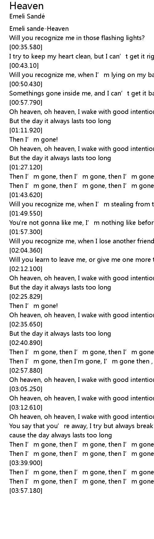 | [03:05.750] | Oh heaven, oh heaven, I wake with good intentions, |