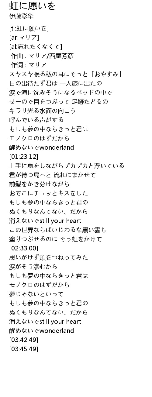 | [02:21.64] | 塗りつぶせるのに そう虹をかけて |