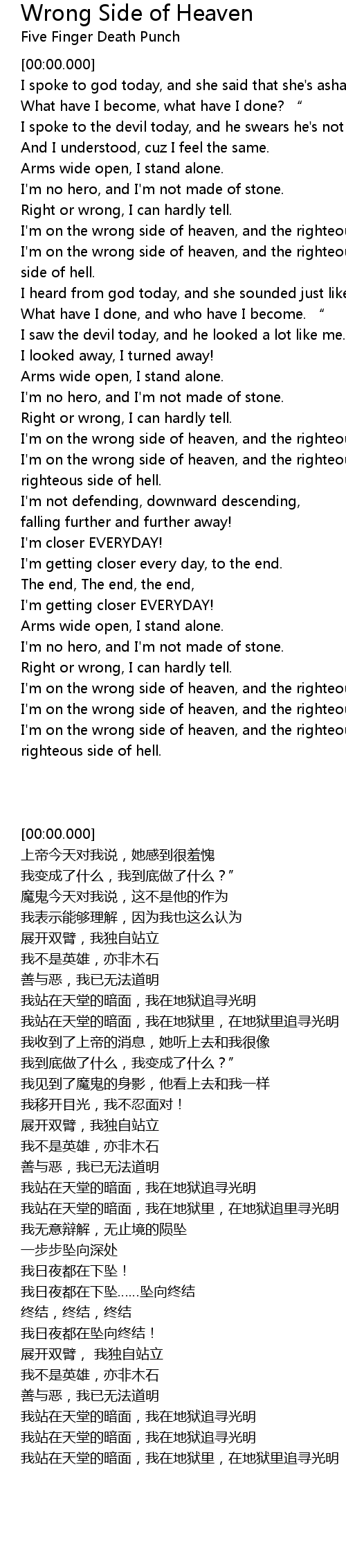 | [02:39.507] | I' m on the wrong side of heaven, and the righteous side, the righteous side of hell. |