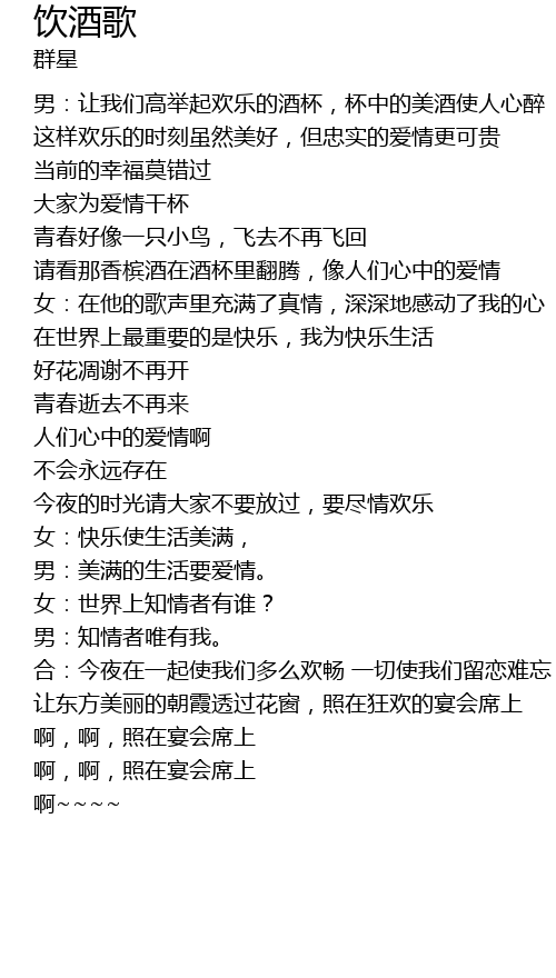 | [00:20.23] | 男:让我们高举起欢乐的酒杯,杯中的美酒使人心醉 |