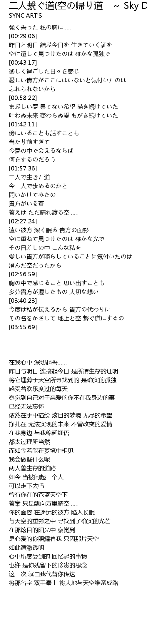 | [03:48.58] | その名をかざして 地上と空 繋ぐ道にするの |