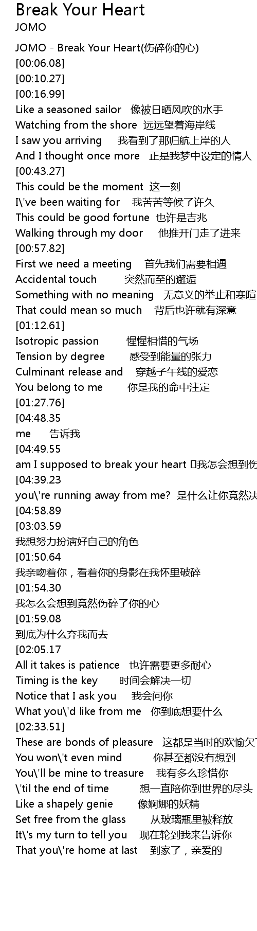 | [00:02.29] | JOMO - Break Your Heart(伤碎你的心) |