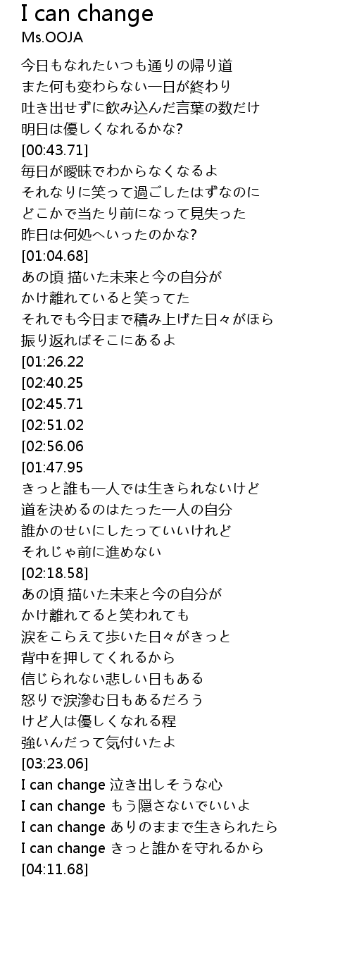 | [03:30.14][02:45.71][01:31.83] | I can change |