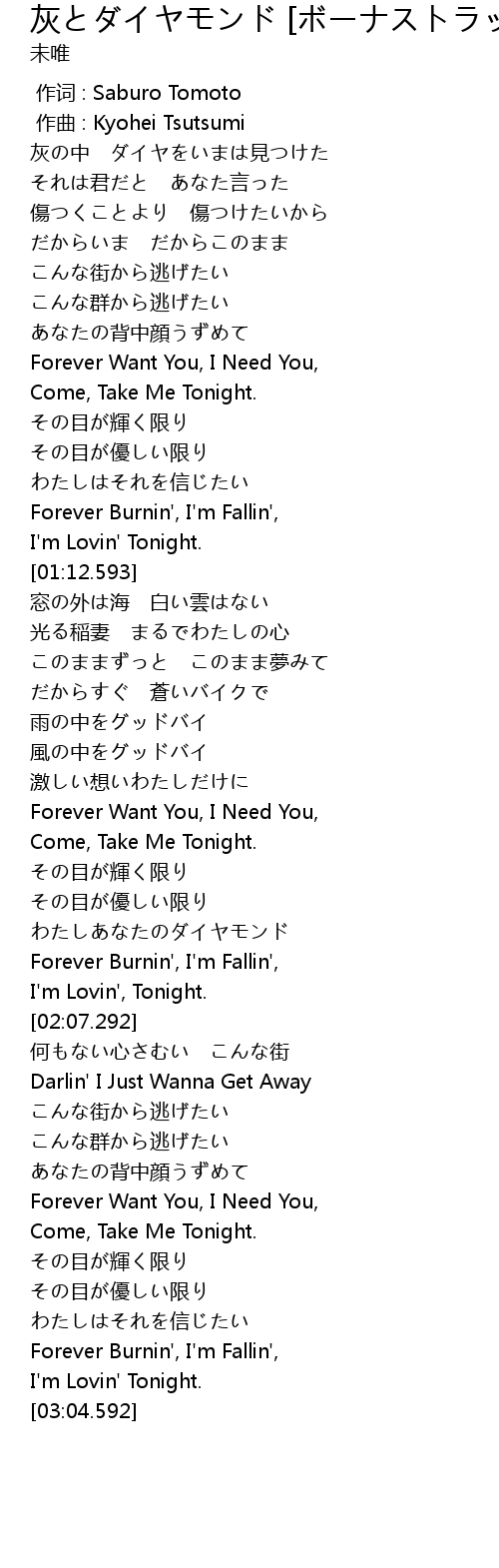| [00:16.530] | 灰の中 ダイヤをいまは見つけた |