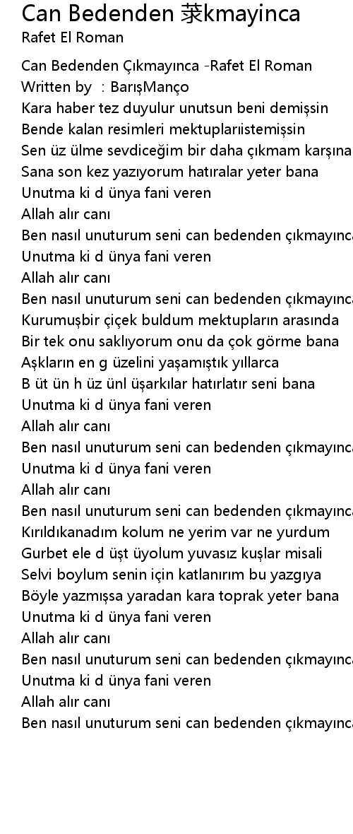 | [00:00.525] | Can Bedenden Çıkmayınca -Rafet El Roman |