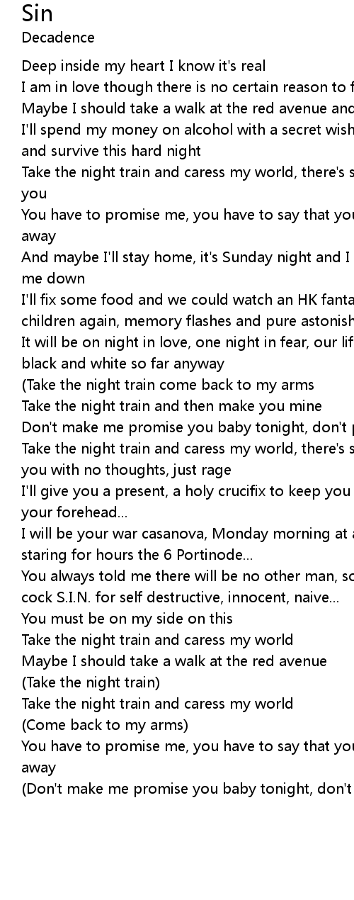 Take the night train and caress my world, there's someone who needs you with no thoughts, just rage |