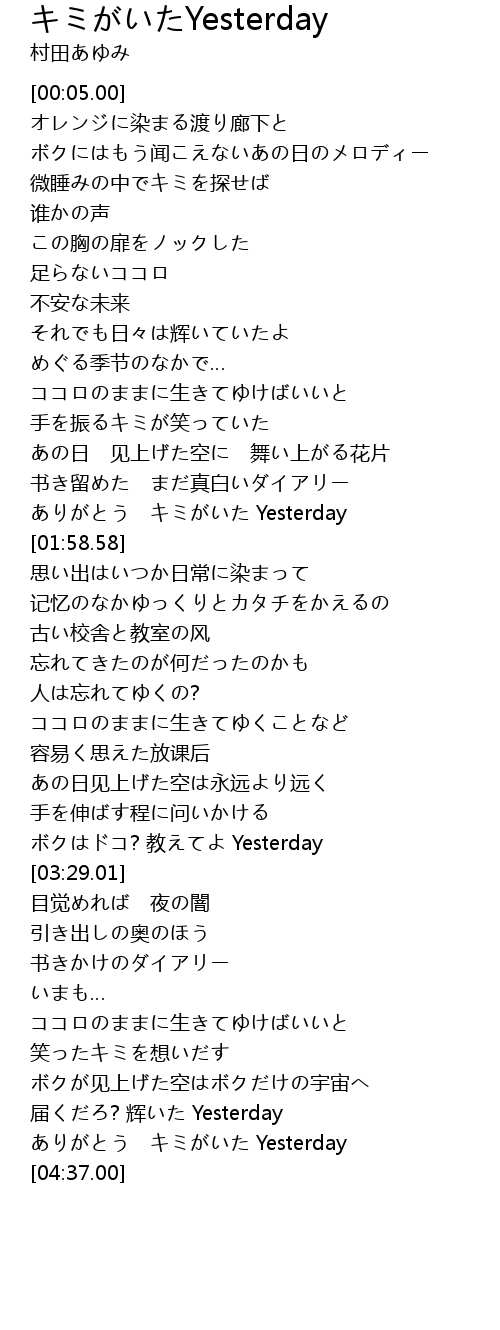 | [04:26.40] | ありがとう キミがいた Yesterday |