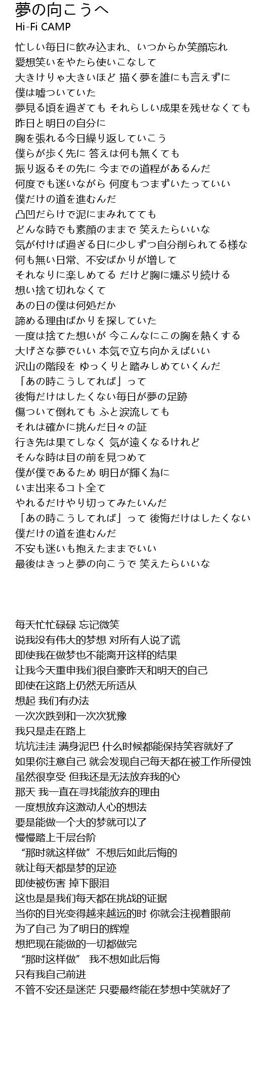 | [03:36.00] | 不安も迷いも抱えたままでいい 最後はきっと夢の向こうで 笑えたらいいな |