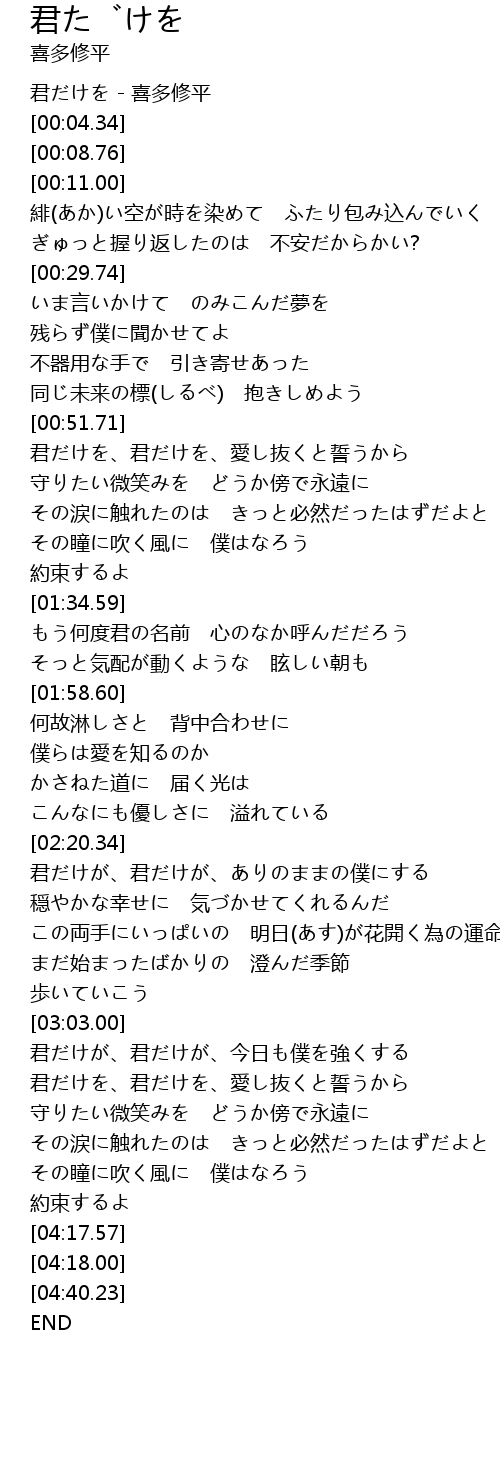| [00:00.17] | 君だけを - 喜多修平 |