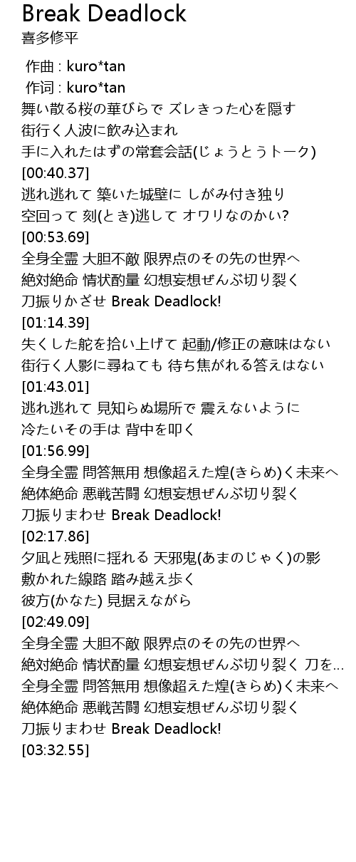 | [01:10.99] | 刀振りかざせ Break Deadlock! |