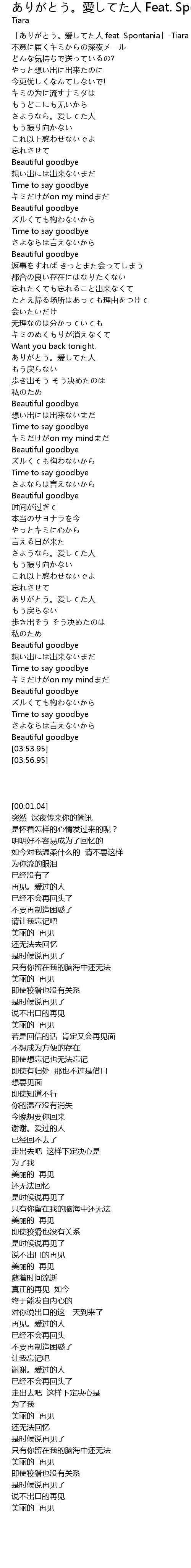 | [00:01.04] | 「ありがとう。爱してた人 feat. Spontania」-Tiara |
