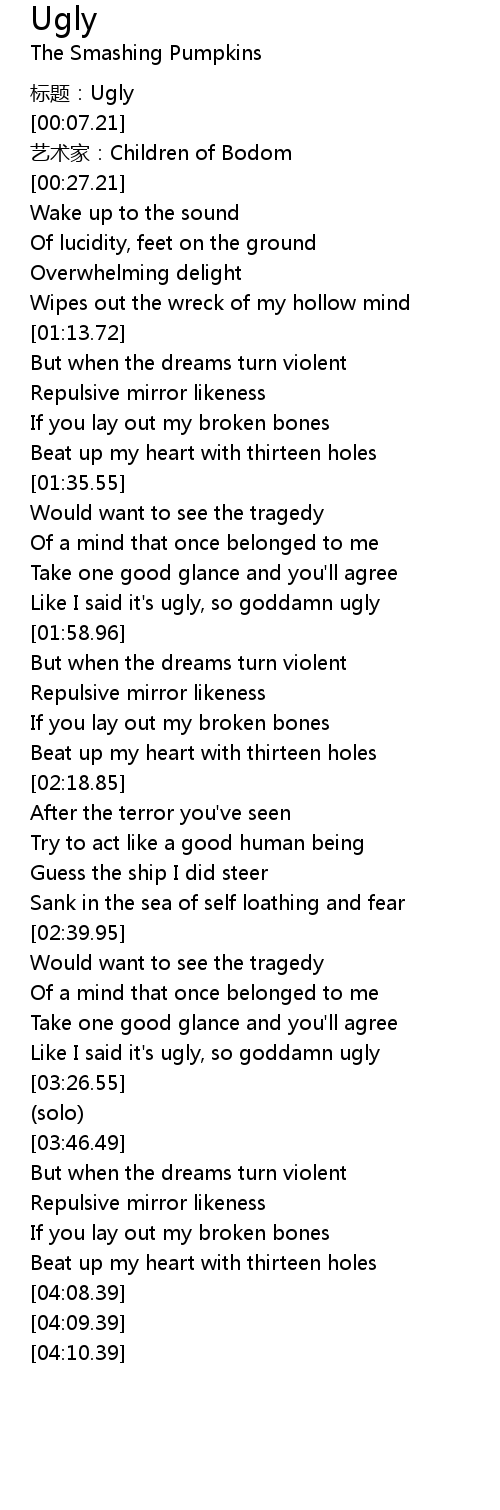 | [03:21.65] | Like I said it' s ugly, so goddamn ugly |